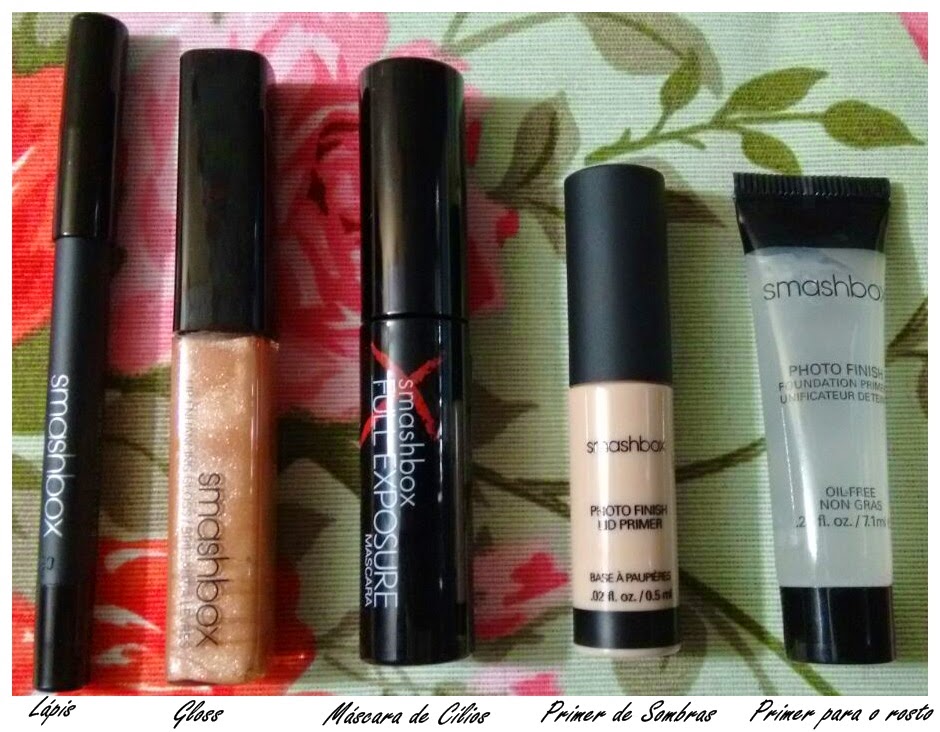 São cinco produtinhos: primer de sombras, primer facial, lápis de olho, gloss e rímel.