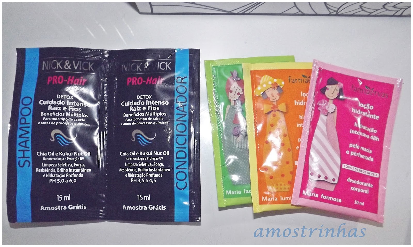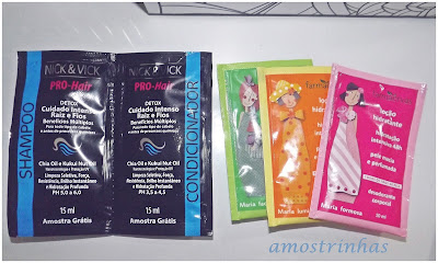 Amostrinhas e brindes: Mentos, fibras alimentares, Shampoo e condicionador Detox Nick & Vick e Loção hidratante Farmaervas