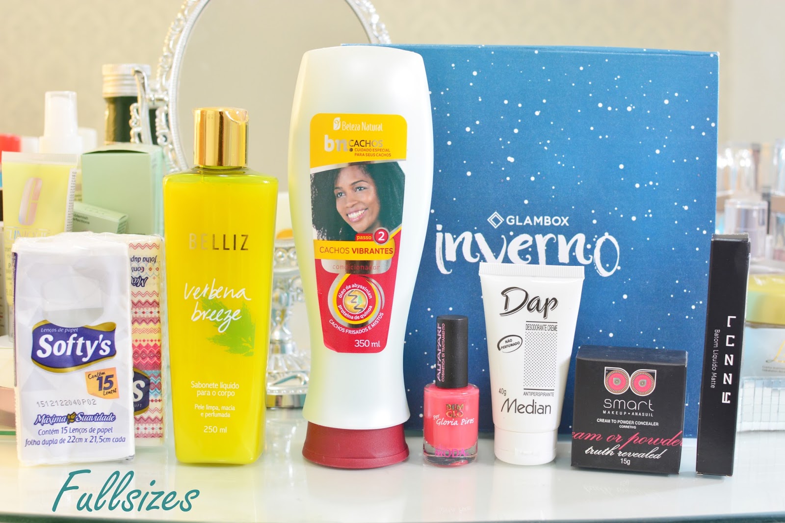 De fullsizes: Lenços, sabonete Belliz, Condicionador do beleza natural, esmalte, desodorante, corretivo Smart, batom liquido da Luzzy.