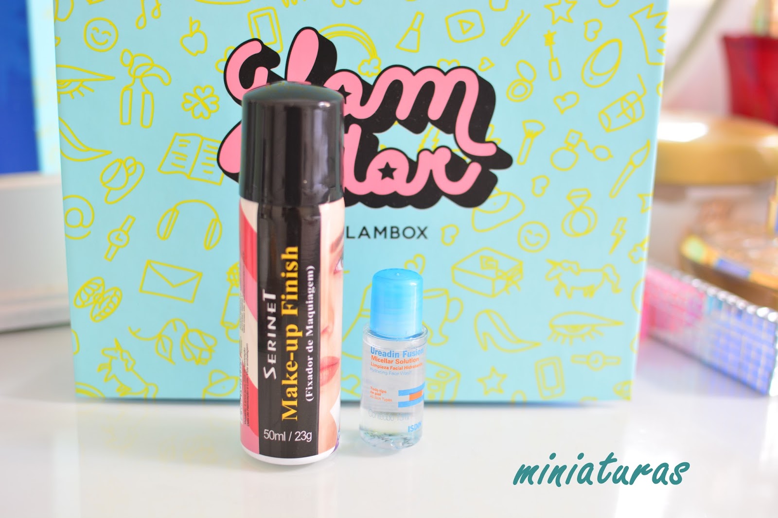 De miniatura e amostrinhas: miniatura do Fixador de maquiagem Serinet e micro-miniatura da água micelar Ureadin. Amostinhas de cabelo da Sillage e da Amend.